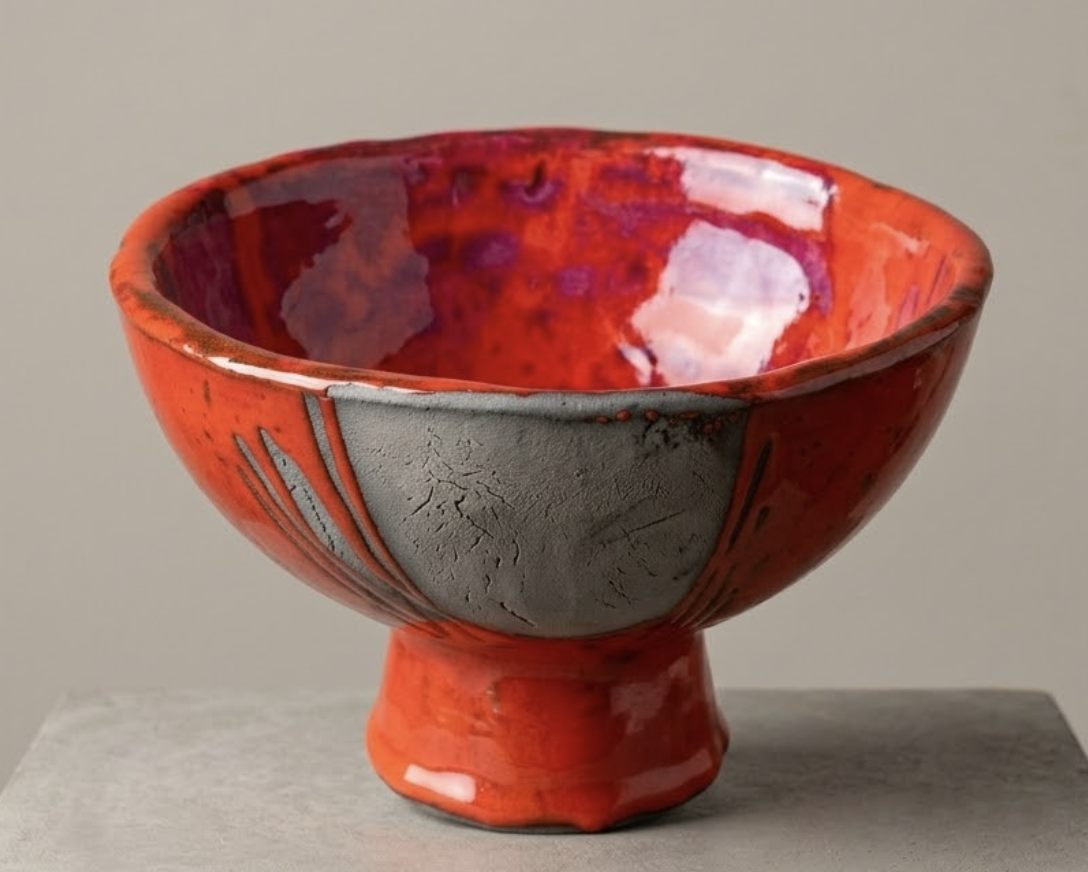 Feuer und Kontrast in ihrer schönsten Form. Die Fußschale IGNIS besticht durch das spannungsreiche Zusammenspiel aus einer glühend roten Reaktivglasur im Inneren und einem matt-schwarzen, haptischen Kontrast im Außenbereich. Ein skulpturales Statement-Piece, das vollständig in freier Aufbautechnik erschaffen wurde.